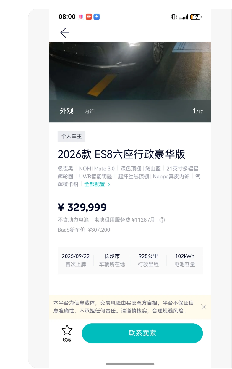 从车辆配置与车况来看,这台二手ES8的“豪华属性”拉满:外观为极夜黑车身搭配21英寸多辐星辉轮圈与气辉橙卡钳,内饰采用黛山蓝Nappa真皮、超纤丝绒顶棚与深色顶棚,还搭载NOMI Mate 3.0交互系统和UWB智能钥匙,配置与新车几乎无差;102kWh电池容量保证续航基础,928公里的行驶里程也意味着车辆核心部件损耗极小,整体呈现“近乎新车”的状态。卖家表示,车辆落地价约31.5万元,期望以33万元左右成交,相比新车BaaS价高出约2.3万元,这一“准新车溢价”成为争议起点。